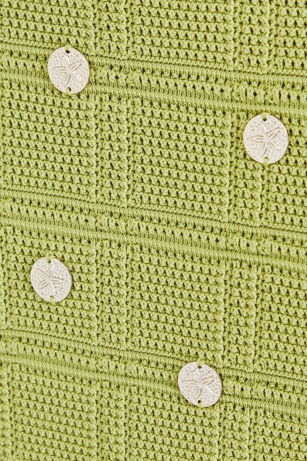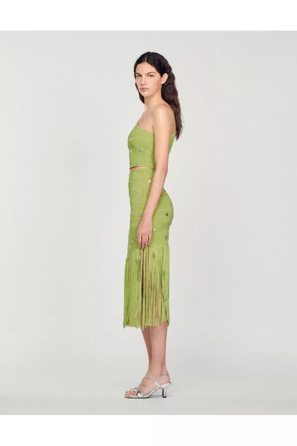 Falda larga recta de crochet calado, decorada con flecos asimétricos en el bajo y lentejuelas martilladas metálicas adornadas por toda la superficie.